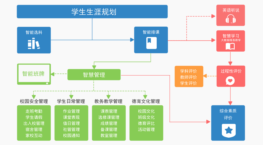 走班考勤、學(xué)生請(qǐng)假、宿舍管理、出入口管理、家?;?dòng)