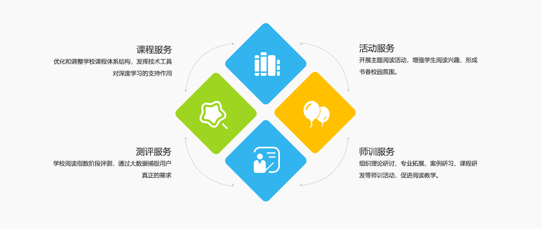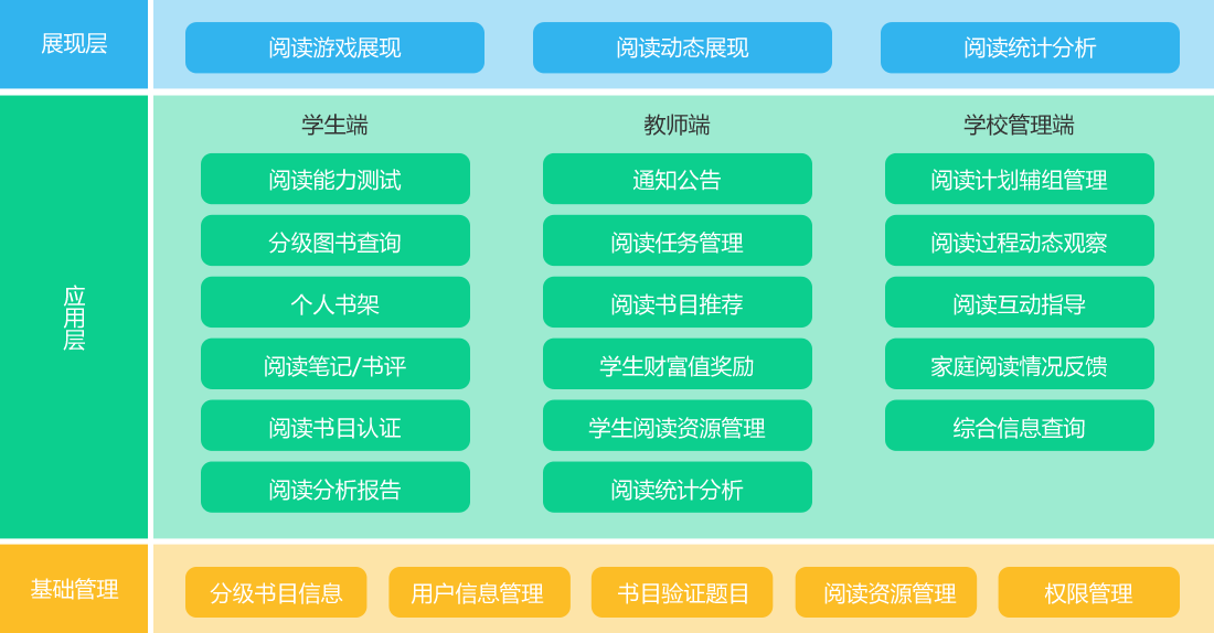 校園閱讀跟蹤評價系統(tǒng)以自主研發(fā)的“分級閱讀理論”為核心,借助互聯(lián)網(wǎng)工具打造閱讀素養(yǎng)評測和訓(xùn)練平臺,并提供線下的課程和師資力量培訓(xùn)、閱讀活動等服務(wù),促進(jìn)學(xué)校整體閱讀,提升學(xué)生個性化閱讀素養(yǎng)。